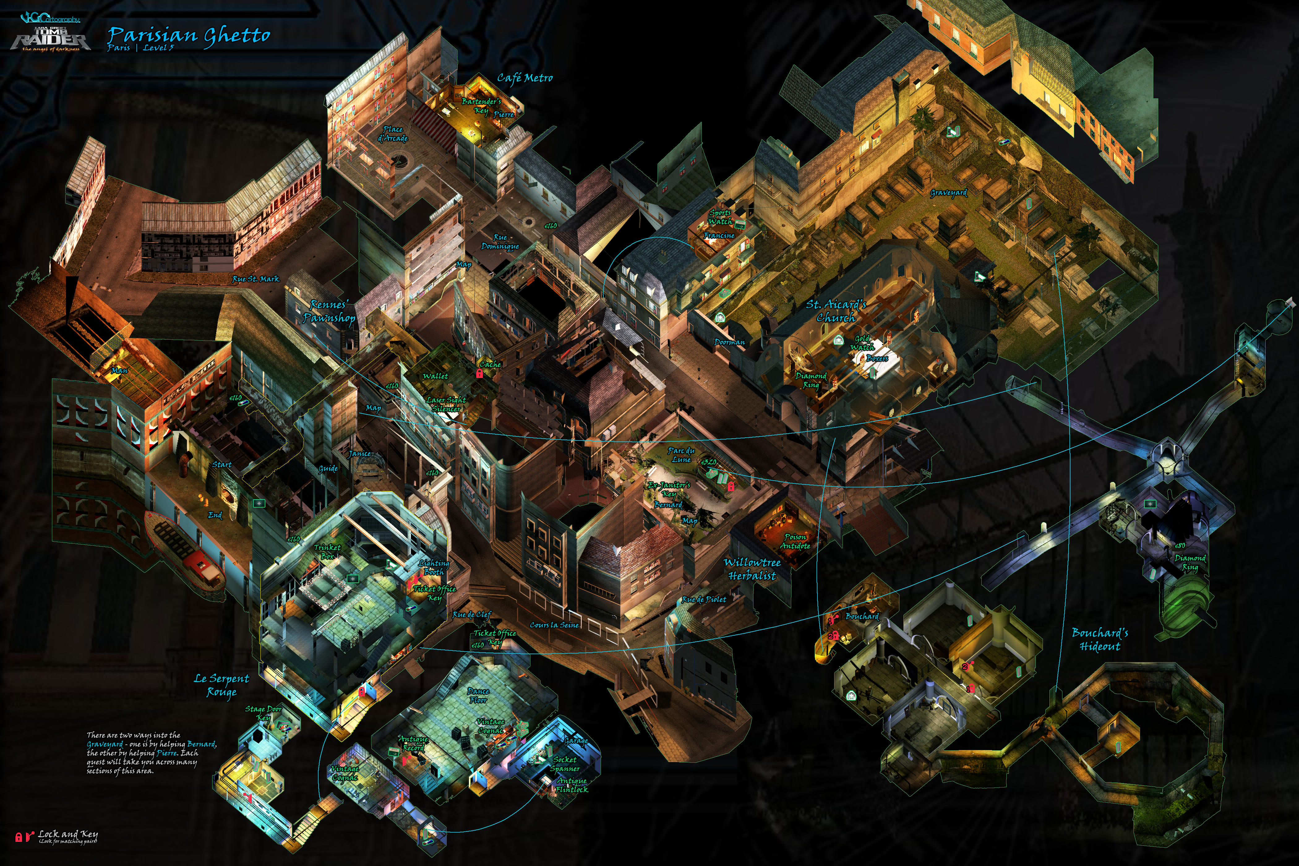 *NOTE ON LEVEL MAPS: VGCartography's Angel of Darkness maps follow a slightly different level-numbering convention than I do. You'll notice most of the Parisian Ghetto-adjacent areas on the same large map. Later, the elemental levels off the Hall of Seasons are included on the same map as the hub level. Visit VGCartography on DeviantArt and follow on Twitter/X and YouTube for more fantastic game maps.