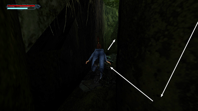 Proceed to another flooded pit. There's no way to avoid this one (and it doesn't affect the achievement/trophy), so jump in, swim across (use Jump plus directions to swim), and climb out on the far side (Action + Forward). (screenshots)