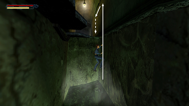 Crossing the fourth pit is the trickiest, so definitely save the game. Jump straight up to grab the electrical cable that runs along above the pit. Traverse forward until Lara is hanging above the small, uneven slab of floor. Once you drop onto this slab, you'll need to react quickly before it collapses. The controls are super janky, so just do your best and reload if necessary. After letting go of the cable, walk one step forward, as the slab settles a little. Then immediately jump forward to land on the narrow, uneven ledge ahead. (Don't jump without first stepping forward, or Lara will grab the cable again, and you'll be stuck.) Once you reach the ledge, activate Walk so Lara doesn't fall. Turn right and quickly move to the end of the ledge, as it begins to crack beneath you. Then jump forward into the hallway. Don't linger on the cracked edge. Immediately move forward onto the solid floor. (screenshots)