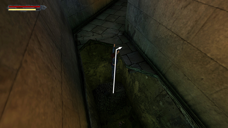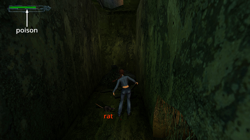 NOTES: The "Let Pit Be" achievement/trophy requires you to avoid falling into the pits in the starting area. So you may want to save the game before proceeding. You'll encounter several rats in this area. Most don't bother Lara, so unless you want all kills, save your ammo and just continue on your way. Even with the laser sight (purchased from RENNES' PAWNSHOP) equipped, I was unable to target the rats from above. I had to climb/fall down to kill them. Occasionally, a rat will bite Lara, and she'll be poisoned. The health bar will turn green and begin to drain. (screenshot) Use an antidote from the Health section of your inventory (assuming you bought some from the WILLOWTREE HERBALIST) or use a large health pack for a full recovery. Smaller health items will restore Lara's health, but not cure the poison.