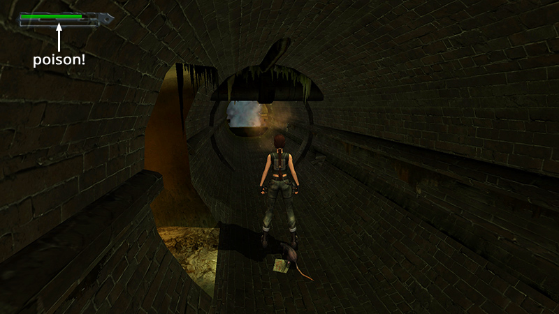 NOTE: The first rat doesn't seem very aggressive, but remastered rats can poison Lara with their bite, causing your health bar to turn green and begin to drain. (screenshot) Use an antidote from the Health section of your inventory (assuming you bought some from the WILLOWTREE HERBALIST) or use a large health pack for a full recovery. Smaller health items will restore Lara's health, but not cure the poison.