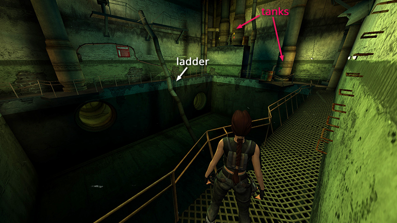 NOTE: If Lara falls into the pool while exploring, there's a ladder on the left (when facing the fuel tanks) where you can climb out. (screenshot)
