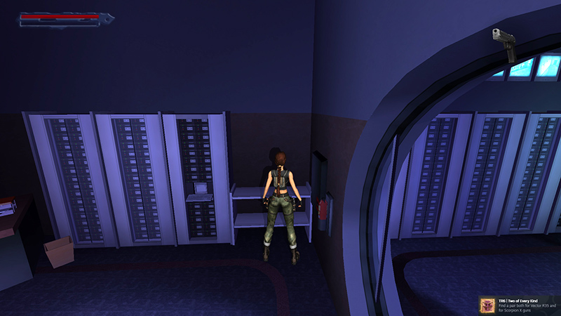 The second door in the long hallway leads to a SECURITY OFFICE. There's another guard (13) inside, so you may want to save before going in. The guard is in the inner room behind the round glass door. He can't see Lara as long as the doors remain closed. So walk forward just as far as the desk near the door. Wait for the guard to move into the corner. Then, when he moves out toward the security monitors and his back is toward you, step forward, and tase him as soon as the doors open. Enter and pick up the VECTOR-R35 (8) on the shelf to the right. Assuming you found the first VECTOR in the DERELICT APARTMENT BLOCK level, you'll now have a pair. This is one of two weapon types needed for the "Two of Every Kind" achievement/trophy. (screenshots)