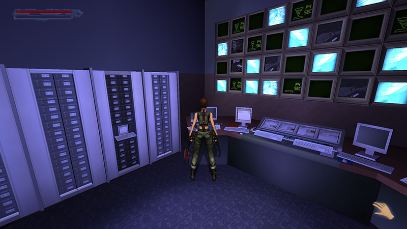 THIRD GALLERY: This is a long, narrow room with paintings on the walls and a single display case in the middle. The security guard (14) on patrol may or may not be facing your way as you enter. If he is, he'll call out and you'll immediately know you've failed. Load your save, wait about 30 seconds, save, and try again. If he's facing away from Lara, shock him quickly. Go to the far end of the room, use the card reader, and go through but don't rush forward. (screenshots)
