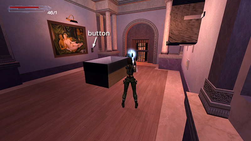 FIRST GALLERY WITH ALARM SYSTEM: This room is protected by laser tripwires. They won't harm Lara, but touching any of them trips an alarm, causing your stealth mission to fail. (screenshots)