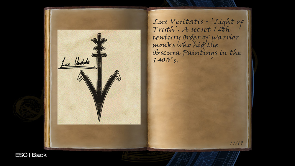 | 11 | Lux Veritatis - 'Light of Truth'. A secret 12th century Order of warrior monks who hid the Obscura Paintings in the 1400's. [includes image] | Margot Carvier's Apartment | screenshot | |