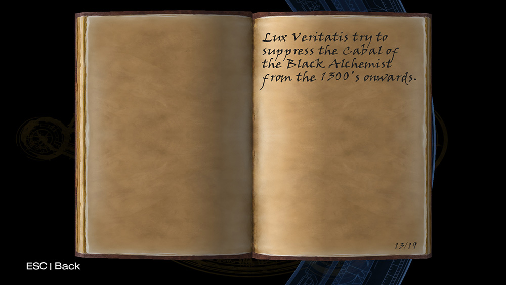 | 13 | Lux Veritatis try to suppress the Cabal of the Black Alchemist from the 1300's onwards. | Margot Carvier's Apartment | screenshot | |