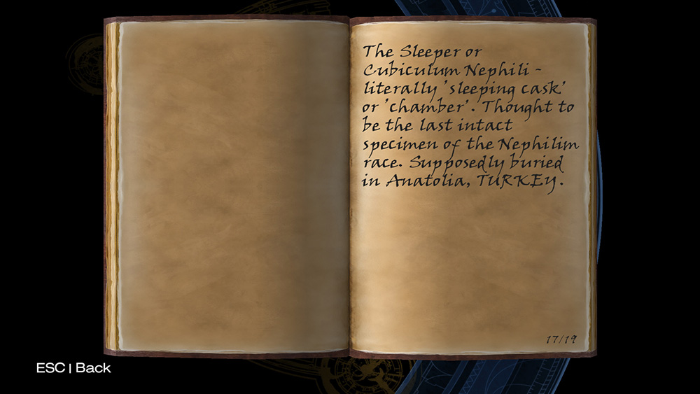 | 17 | The Sleeper or Cubiculum Nephili - literally 'sleeping cask' or 'chamber'. Thought to be the last intact specimen of the Nephilim race. Supposedly buried in Anatolia, TURKEY. | Margot Carvier's Apartment | screenshot | |