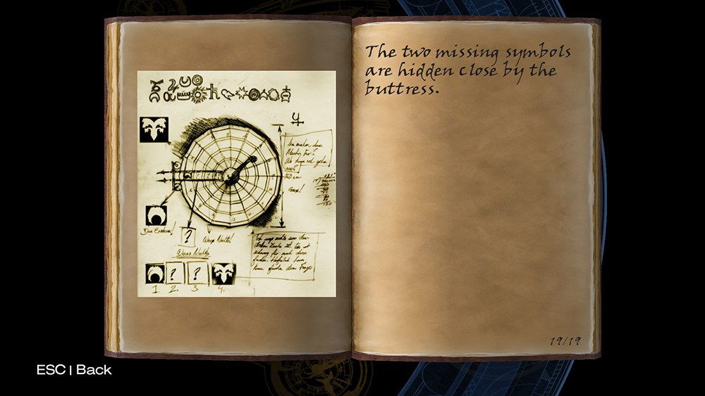 | 19 | The two missing symbols are hidden close by the buttress. [includes image] | Margot Carvier's Apartment | screenshot | |