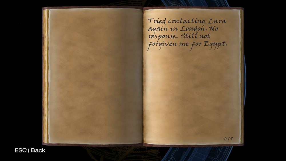 | 4 | Tried contacting Lara again in London. Still not forgiven me for Egypt. | Margot Carvier's Apartment | screenshot | |