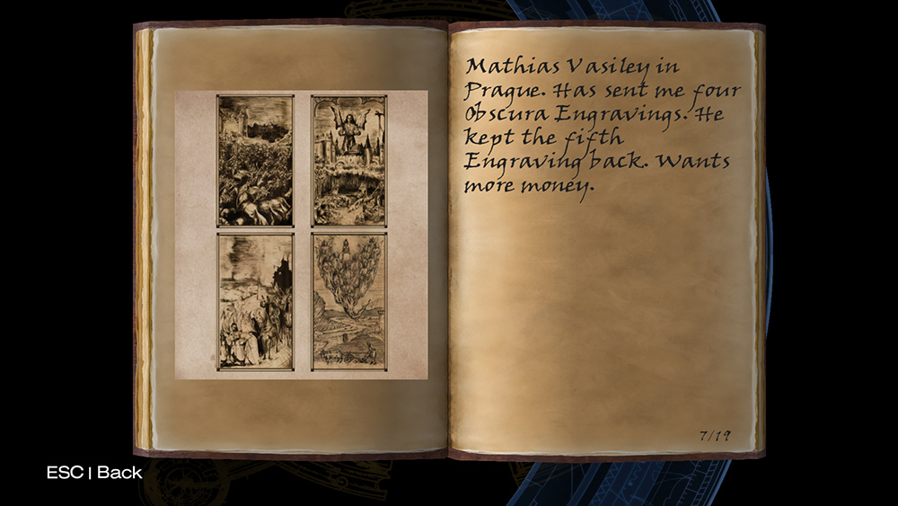 | 7 | Mathias Vasiley in Prague. Has sent me four Obscura Engravings. He kept the fifth Engraving back. Wants more money. [includes image] | Margot Carvier's Apartment | screenshot | |