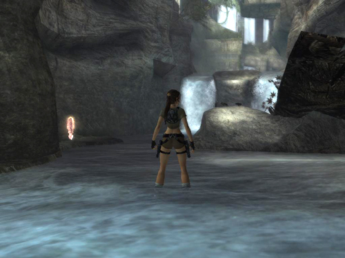Here you'll find some small boulders that Lara can kick by pressing Interact (E on the PC, Triangle on the PS2, Y on the Xbox), the rough equivalent of Action in earlier games.(****) There's no purpose to this except to practice the controls. You'll also find another bronze reward (2/10) ahead on the left, tucked into a corner. (screenshot) Grab it and return to the pool below the falls.