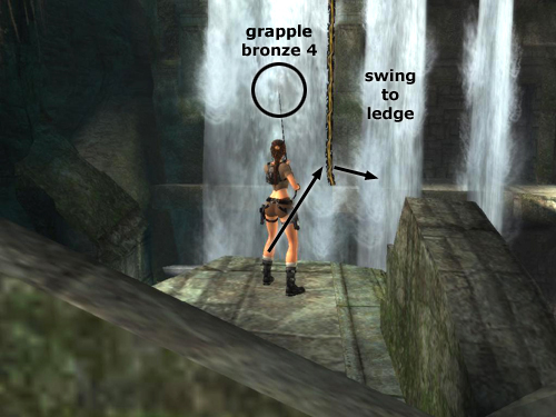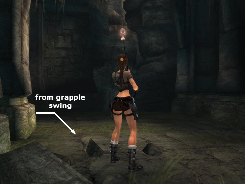 NOTE: It really doesn't matter which way Lara is facing when you jump as long as the camera is pointed where you want her to go. But centering the camera behind her makes it easier to aim for the chain.