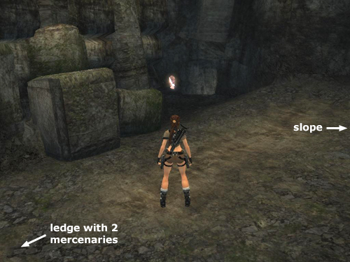 When Lara reaches the base of the slope, 2 more mercenaries appear on the ledge to the left. Kill them and pick up any health packs dropped so far.