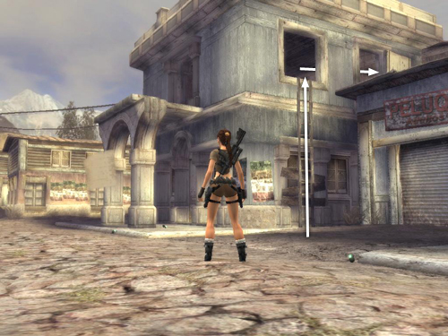 PARAÍSO TOWN SQUARE: When the cut scene ends, Lara is standing on the wide stairs of the big building (town hall? church?) with armed men closing in. Take cover. The area below the stairs on the right is one good hiding place. Only the one soldier on the veranda to the right can hit Lara from here. Then gradually move out and deal with the other 3 mercenaries one or two at a time. (strategy and screenshots)