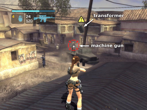 Press Interact when the environmental hazard icon appears to shoot the explosive objects (i.e., the truck's gas tank, the barrel of fuel on the wheeled cart and the propane tank on the other side of the square) to blow them up, killing any nearby bad guys. Just remember, enemies can do the same to Lara, so don't stand right next to any of these.