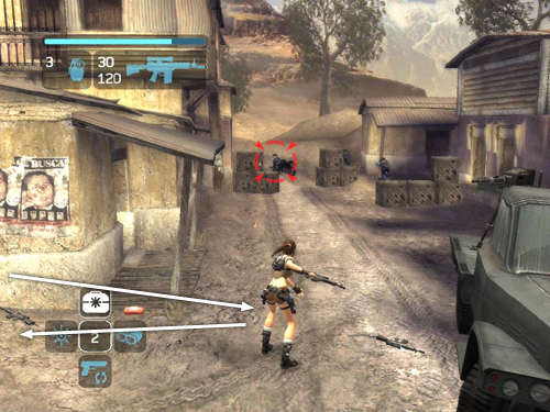 Now, if you haven't done so already, drop down to the ground. Pick up any ammo, grenades or health packs you need. Then take care of the last 3 mercenaries near the end of the road. You can climb on the truck and use the big gun to blast them. (Press Interact to grab onto the gun, then shoot as usual.) Or use the corner of the building on the left side of the T-intersection for cover. Step out to shoot or throw a grenade and then move back behind the wall to reload or dodge any grenades the enemies lob at Lara. (screenshot)