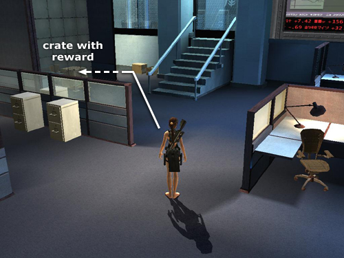 Zip says there's no way out, but Lara disagrees. Before findingor, more accurately, makingan exit, locate a silver reward (3/4) in the left of the two metal cabinets in the raised conference area (screenshot) and a bronze reward (5/6) in a wooden crate in the tiny office in the far left corner of the room, when facing the big display screen. (screenshot)