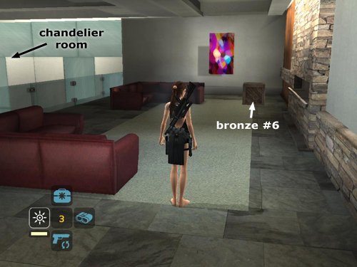 Don't go down the stairs yet. Instead, run back toward the entrance and turn into the small lounge, where 2 more goons will be waiting. If you don't see them immediately, go through the lounge and turn left. They'll be on the balcony ahead. This balcony is also a good vantage point for taking out any stragglers that weren't killed by the chandelier, as well as the sixth bad guy, who enters on the lower level when everyone else is dead.