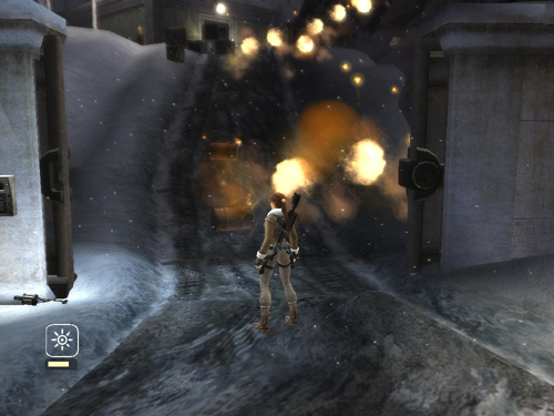COMMAND CENTER: As soon as you do, the 2 soldiers at the top of the hill start rolling explosive barrels down toward you. The most direct strategy here is to run through the gate past CHECKPOINT 5. The gate then closes behind Lara, so there's nowhere to go but up. Run up the hill along the snowbank at the left edge of the road, so the barrels won't hit Lara. If you run with weapon drawn, tapping Interact as you go, you should be able to destroy all the barrels. (screenshot) If the soldiers survive the explosions, finish them off when you reach the top.