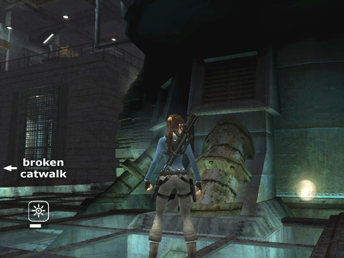 Drop to the floor and cross the room to the generator. You can grapple and pull the valve on the front of the generator, but it won't start without fuel. Climb onto the formerly white metal box on the left. Jump to grab the whitish louvered vent on the wall between the yellow pipes. Climb to the right and then jump to grab the edge of the catwalk; pull up. Follow the catwalk, jumping the gap, and continue around behind the generator. Or, for a shortcut, jump onto the narrow metal railing on the right side of the generator. Jump from there to grab the catwalk behind it on the right and pull up. (Thanks to MMAN for this.)