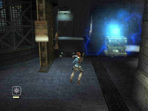 Go through the doorway to the left. Jump to grab the horizontal pole. Swing and jump to grab the rope. Swinging and jump to the opposite opening. If Lara falls, use the box to climb up and try again. Slide down the next ramp, jumping to clear the live wires. Follow the passage to the right, shoot the fan and duck/roll under the wires. Continue along the passage to the left. Slide down another ramp, shooting another fan and jumping over more electrified wires as you slide. Take a running jump over the next set of wires; duck/roll under the next. Follow the hall to the right. Then slide down another slope, jumping to clear another tangle of wires.