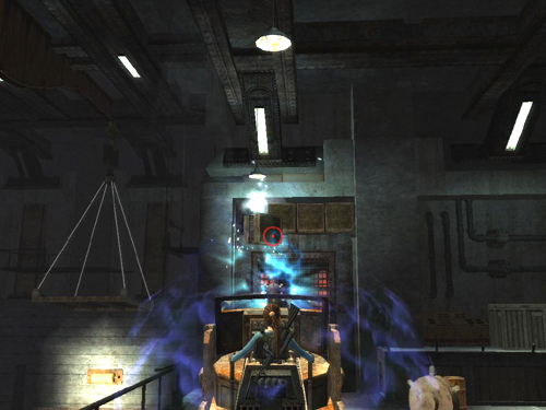 Now run to the Tesla gun in the middle of the room and press Interact to get on. Target the large, dangling electrodes. Tap the fire button to push each electrode away until it makes a connection with the pair of live electrodes against the wall. (Two good pushes should do it.) When that happens, electricity arcs between the electrode you are pushing and the neighboring electrodes. Repeat the process with the other three electrodes, swinging the gun around to target each one in turn. You must do this quickly for all four to be activated at the same time. Then the force field around the sword fragment is removed. Get off the gun, point the camera at the sword fragment hanging directly above the gun, and quickly press Grapple to snag it.