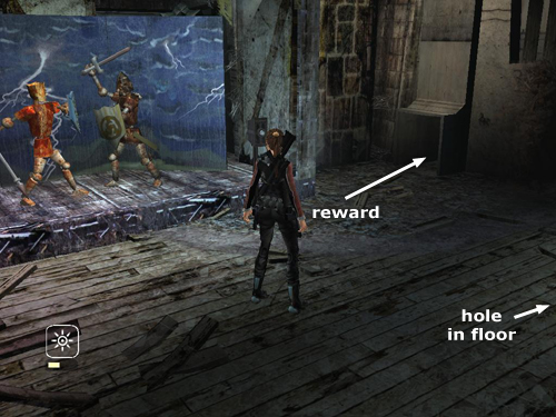 KING ARTHUR'S COURT EXHIBIT: Throughout this area, you can press buttons to activate the various exhibits. These elicit anguished comments about historical inaccuracy from Alister and a few jokes from Zip. Mind the hole in the floor. If Lara does fall through, there's a pile of debris and a makeshift ladder she can use to climb out. (screenshot)