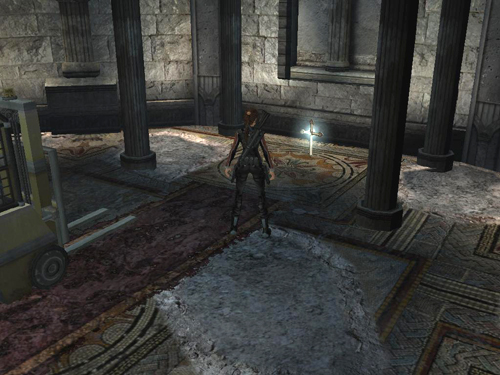 Now, to retrieve the sword fragment and open the door. Grasp the end of Bedivere's crypt and pull it across the floor. Notice the two columns in the middle of the room. One is broken off at the top. Push the chunk of crypt up against the broken column. (These screenshots show how to open the exit.)