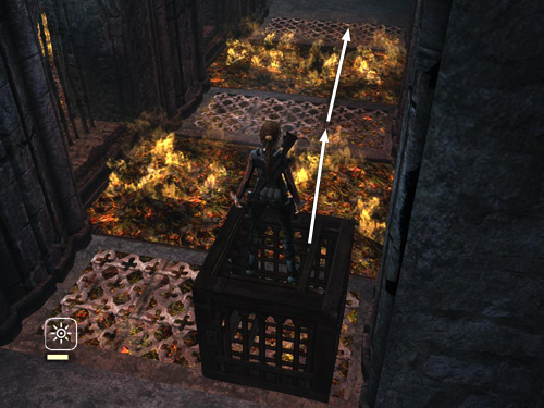 Now the intermittent flames below the grates are off. So you don't need the cages to cross as long as you jump carefully over the areas with burning coals. Note that Lara will jump farther and higher with pistols drawn.
