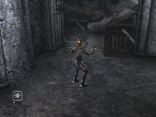 GOLD REWARD: Obtaining the final reward is a multi-step process. You won't have to go out of your way, though, since the gold reward is on the way to the exit. (The entire sequence is shown in these screenshots and this video.) Begin by using the metal cage to climb up onto the ledge opposite the one where the soldiers were. On the right is a movable panel inscribed with the Roman numeral I. Push the panel as far as it will go.