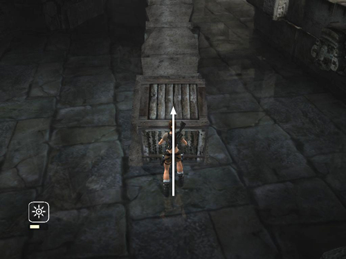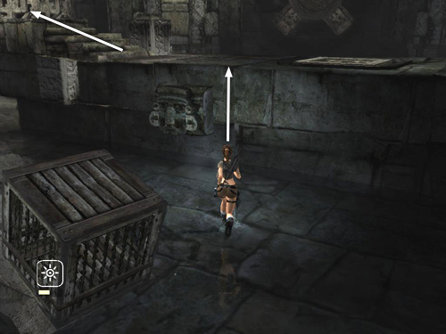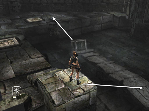 The way out is on the high ledge at the far end of the room. To open it you must activate the 3 square pressure pads on the long ledge near the entrance. The left and right pads control the huge gears on each side wall. The center pad actually raises the door. All three pads must be depressed at the same time for the mechanism to work. You'll need 2 of the 3 movable cages. Lara will press the third pad. This sequence is also shown in a gameplay video.