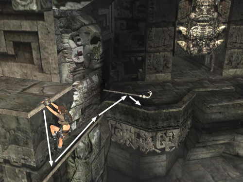 Climb the chain and jump to grab the handhold ahead. (Here it may help to move the camera behind Lara and then jump forward.) Traverse around the corner to the right.