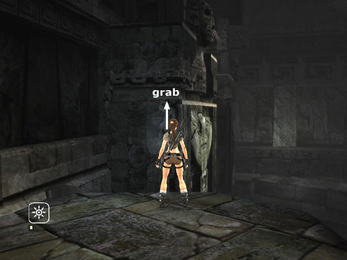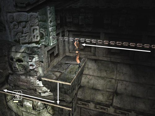 . . . and around the corner. Once Lara is hanging with her back toward the ledge near the exit, lean back and jump to land there.