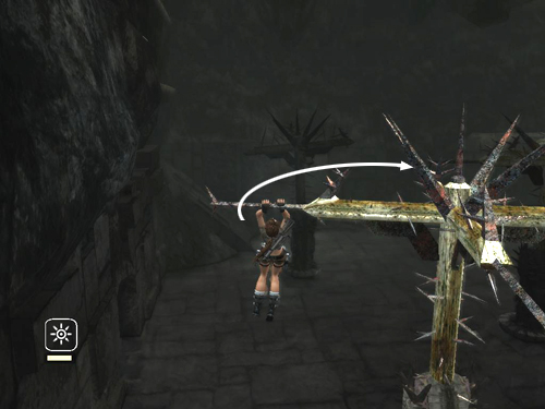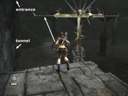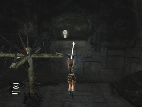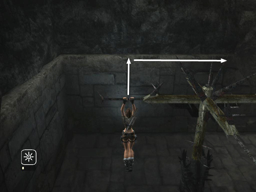 Stand on the raised area in the corner of the room with the alcove containing the silver reward behind Lara to the right and the entrance and tunnel ahead on her left, as shown above. Face the left horizontal "arm" of the rack straight ahead and take a running jump to grab it.