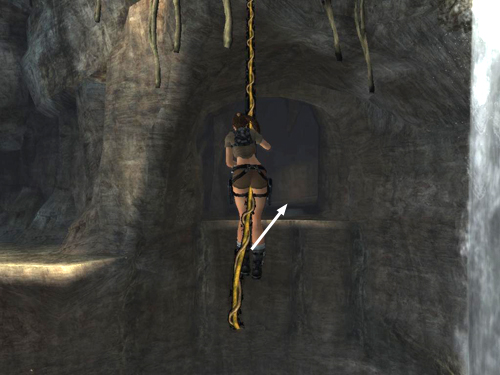 While hanging from the vine, turn left to face the cave between the ledge where Lara was just standing and the waterfall. Swing toward the cave and Jump to leap off the vine into the cave. (The in-game instructions explain how the keys work. Check your booklet or the Controls page for more info.)