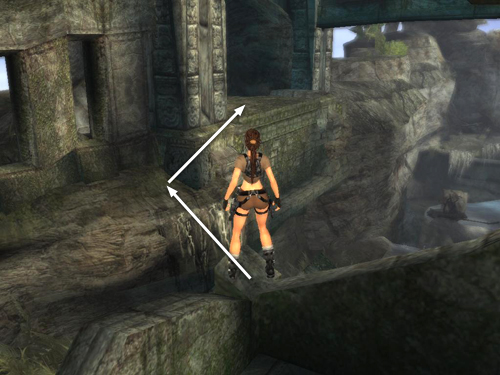Alternatively, instead of using the vine, climb onto the corner of the low wall and jump to the ledge below the square pillars then onto the broken bridge. (Aiming for the right end of the ledge seems to work best.) This jump is a bit trickier to land, but it saves even more time.