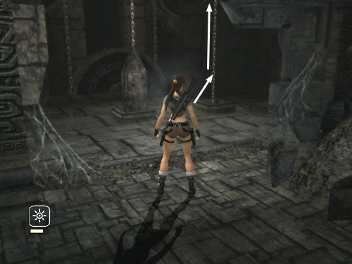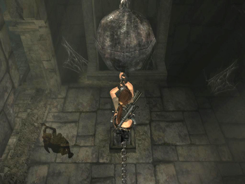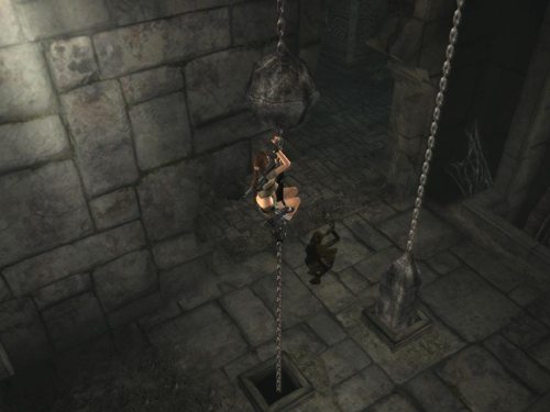 NOTE: It really doesn't matter which way Lara is facing when you jump as long as the camera is pointed where you want her to go. But centering the camera behind her makes it easier to aim for the chain.