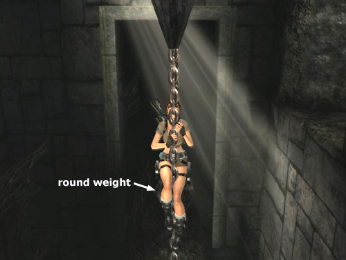 As soon as Lara is higher than the round weight on the other chain, jump to grab onto that chain above the weight. Again, you can turn Lara toward the chain if you like, but it doesn't matter which way she is facing. Just point the camera directly toward the first chain and jump forward and she should catch it.
