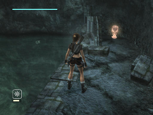 If you look back into the water from this ledge, you'll see the tunnel you came from on the left. It's dimly lit and sort of purple. Jump into the water and swim down through the brightly lit tunnel on the right. Surface and climb out of the water near CHECKPOINT 11.