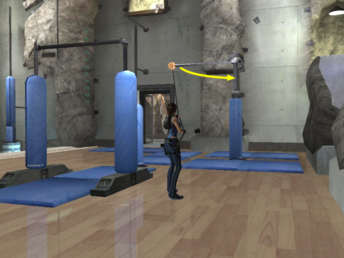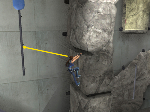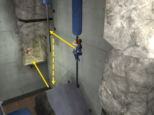 Adjust Lara's left-right positioning if necessary and jump back to grab the vertical pole hanging from the ceiling.