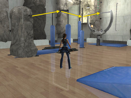Swing around and jump to grab the second horizontal pole. Swing and jump from the second pole to grab the crevice in the corner rock formation.