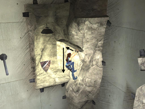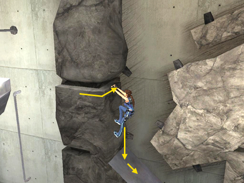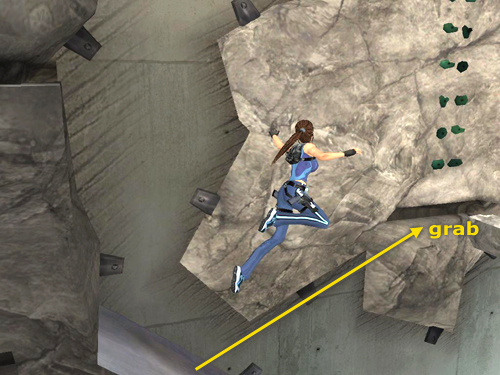 Again climb around to the right. Drop onto the slope, and before Lara can slide off, quickly press Jump (no need to jump in a particular direction). . .