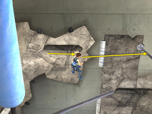 Climb along the crevice to the right as far as you can. Jump to the right to grab the first of two horizontal poles extending from the wall.