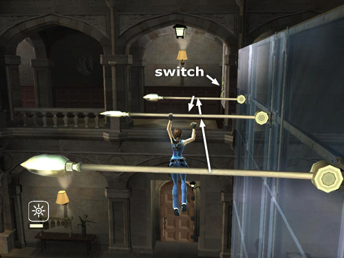 Swing around and jump from one bar to the next and finally to the opposite balcony. Quickly touch the second switch, again by pressing Interact.