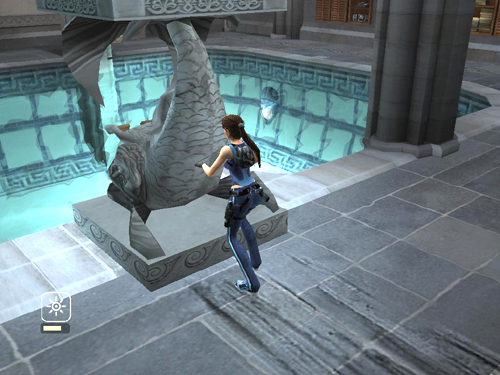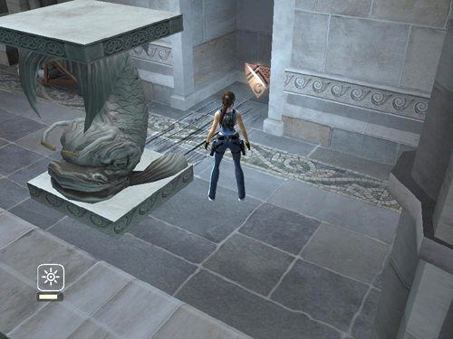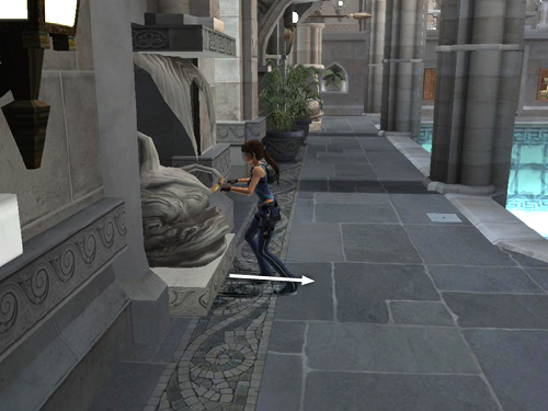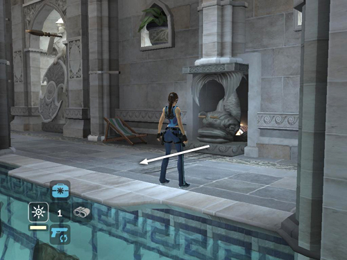 From the entrance to the swimming pool room, make your way forward along the right wall. Note the carved, fish-shaped pillars with handles. These move. Pull the first one out from the wall.