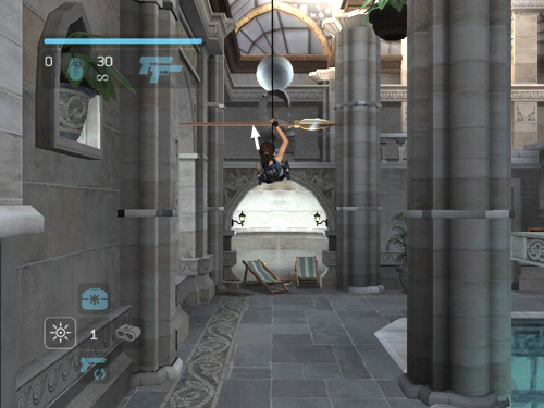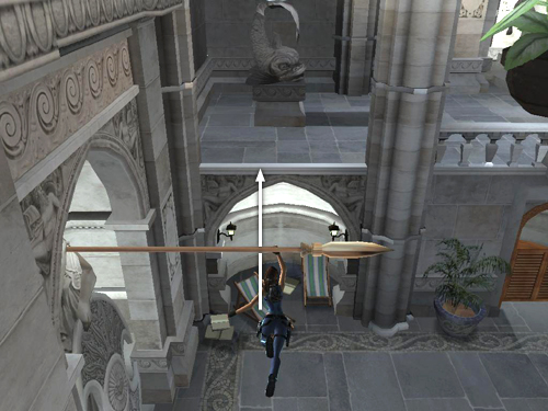 Turn to face the pool and then move to the left side of the balcony. If you haven't done so already, use the magnetic grapple to extend the spears held by the statues along the left wall. Take a running jump to grab the first spear.