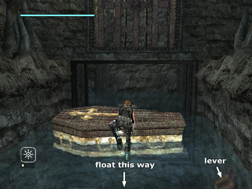 Position the coffin close enough to the gate so you can jump on top of it. Then jump into the water on the other side and let the current carry Lara away.