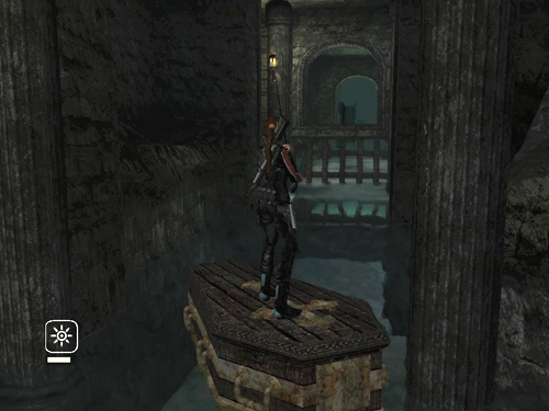 Turn so that gate is behind Lara and you'll see a silver reward (4/5) in a raised alcove at the end of the passageway straight ahead. Grapple the sconce beside the alcove and pull the coffin back along the passage toward the alcove.