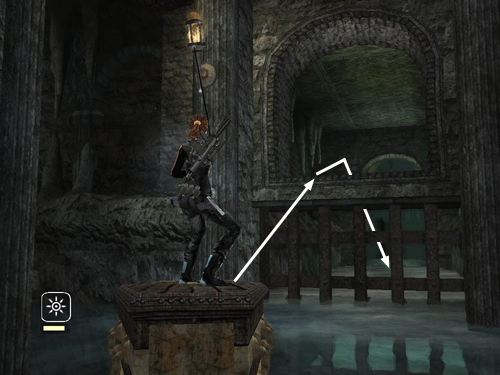 Get on top of the coffin again and float along with the current to the intersection near the metal gate where the water is flowing out of this area. (You can grapple the wall sconce and pull to go faster if you like.)